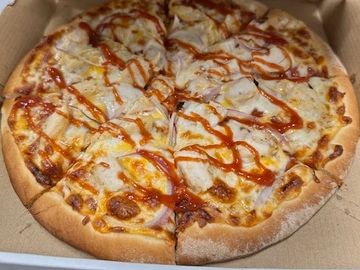 Sweet & tangy BBQ sauce topped with a three-cheese blend, chicken & red onion with a BBQ sauce drizzle