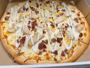 Ranch sauce topped with a three-cheese blend, chicken & bacon chunks with a ranch sauce drizzle