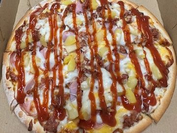 Sweet & tangy BBQ sauce topped with a three-cheese blend, ham, bacon chunks & pineapple with a BBQ sauce drizzle