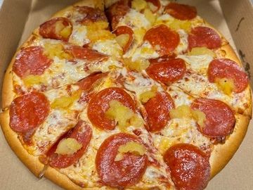 Red sauce topped with a three-cheese blend, pepperoni & pineapple