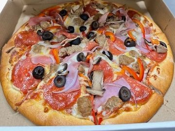 three-cheese blend, pepperoni, Italian sausage, ham, red onion, black olives & mushrooms